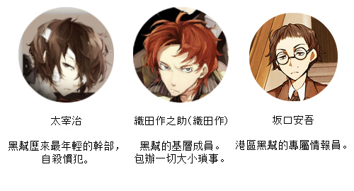 旗下幹部太宰治、基層成員織田作、情報員坂口安吾,